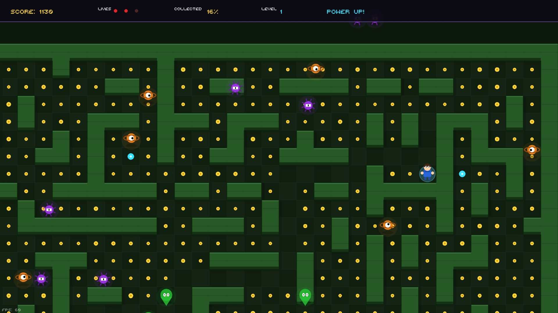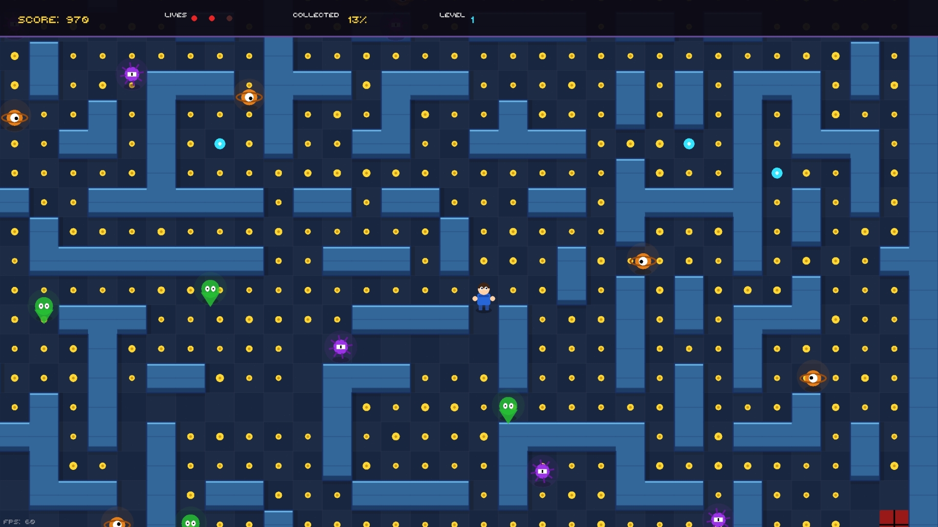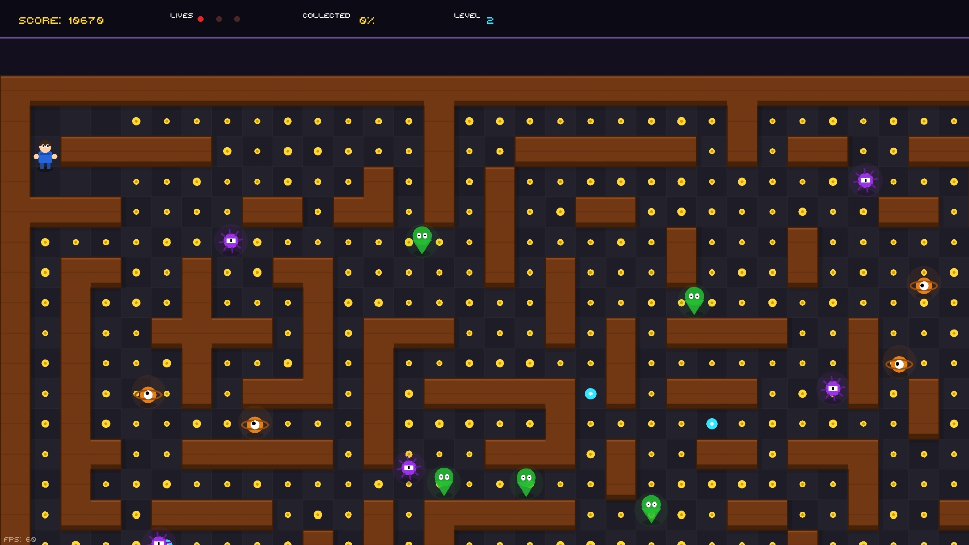 Every run is unique thanks to procedural generation. The visual theme of the maze changes with each new level. You can pause the game at any time by pressing P and return to the main menu with Escape.